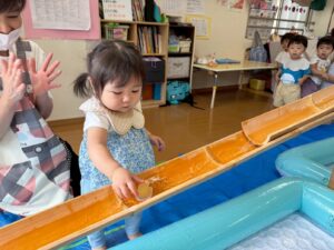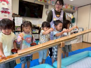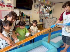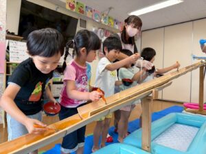 初めて、園内での流しそうめんにチャレンジ!昨年までは、姉妹園で大きなお友達のみ参加させてもらっていましたが、小さなお友達にもいろいろな経験をしてほしいという思いから、今年は園内でやってみることにしました。そうめんだけでなく、ゼリーやキラキラお星さまの人参、たこさんウインナーも流れてきましたよ!涼しい室内でじっくりと味わうことができ、笑顔溢れる楽しい行事となりました!