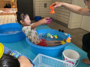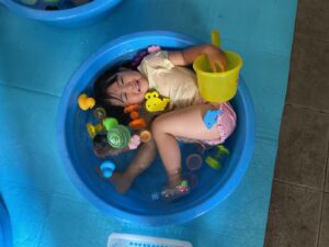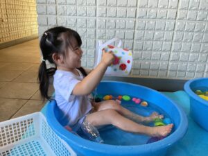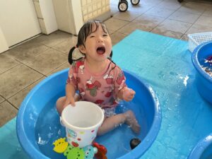 玄関前で楽しく水遊び!タライの中で、いい気持ち~♪