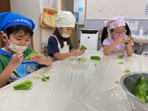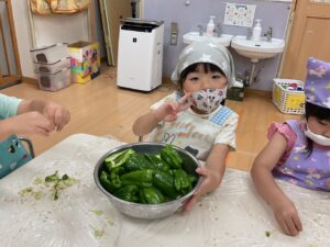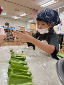 においをかいだり、きれいに並べたり。。。ピーマンは苦手な子が多いですが、食育活動を通じて食材への関心を深めてもらえると嬉しいです。