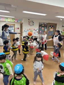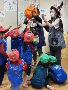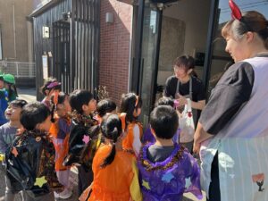 「キャンディがふってきた!?」ピニャータ割りで大興奮!ご近所のレストランで「トリックオアトリート!!」お菓子をもらえて嬉しそうな子ども達でした💛